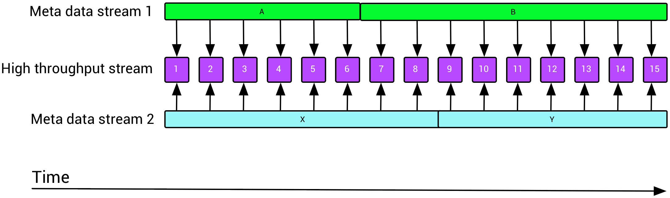 一个非常常见的场景是,我们使用了关键的、慢吞吐量的元数据流,我们希望使用这些数据流在高吞吐量数据流上进行丰富,如下所示: