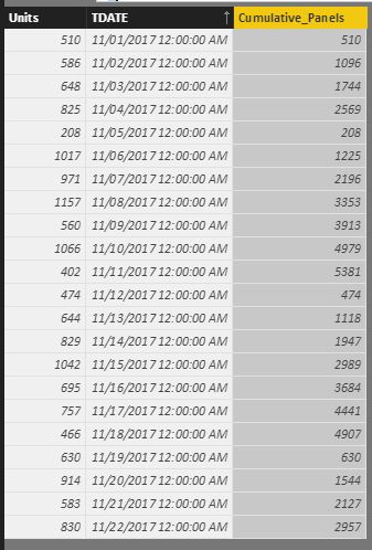Cumulative_Panels = SUMX ( FILTER ( Query1, WEEKNUM ( Query1[TDATE] ) = WEEKNUM ( EARLIER ( Query1[TDATE]) ) && Query1[TDATE] <= EARLIER ( Query1[TDATE] ) ), Query1[Units] ),这就是我得到的