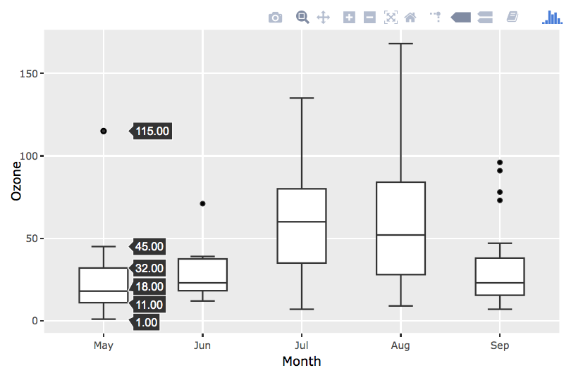 此方法将获得相同的结果,但不显示框图摘要统计值悬停。移除盒图层上的离群点和悬停,并用悬停信息覆盖只包含异常值的geom_point层。文中给出了这里中孤立点的定义。当处理更复杂的图形时,这种方法比其他解决方案工作得更好(例如,并排排列方框图)。有趣的是,用于此数据的ggplot方格图与ggplot图并不相同。8月上边的篱笆须比8月的上栅栏须延展得更远。