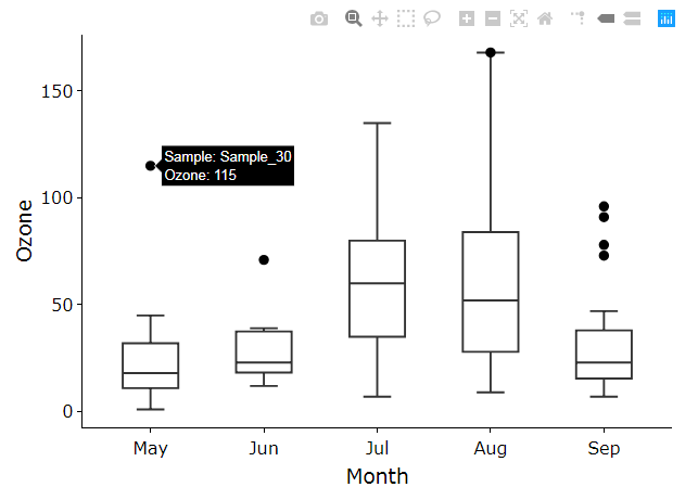 我正在尝试用ggplot创建一个方格图,并巧妙地使用dataset airquality,其中Month位于x轴上,Ozone值位于y轴上。我的目的是注释这个图,以便当我悬停在离群点上时,除了臭氧值之外,它还应该显示Sample名称: