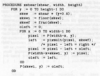 Paeth论文中给出的算法(从1986年开始)似乎是对剪切变换进行第二步(插值)的一种精心优化的方法。我认为这可以归结为沿x轴的分段线性插值,但是以一种不需要对输出图像中的每个像素进行多个数组查找的形式编写。一种更清晰(且效率稍低)的方法可能会涉及到一些东西,比如斜and*像素(x-斜维-1,y) +(1-斜and)*像素(x-斜维,y)。
