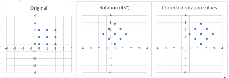 问题:虽然计算值似乎是正确的,并且图形表示显示旋转实际上是有效的,但我不知道如何在固定网格上拟合计算值--图像(或2d数组)--不失真它。此外,我也不完全理解Paeth文件中给出的实现(对于x轴剪切):