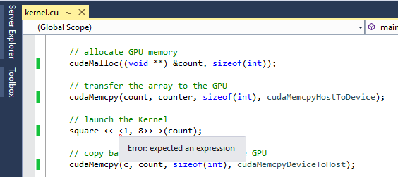 另外,我用nvcc square.cu编译了它,但是输出是相同的。我在VS中有内核启动语法错误,但我认为它与输出无关(但是映像与另一个程序相关):
