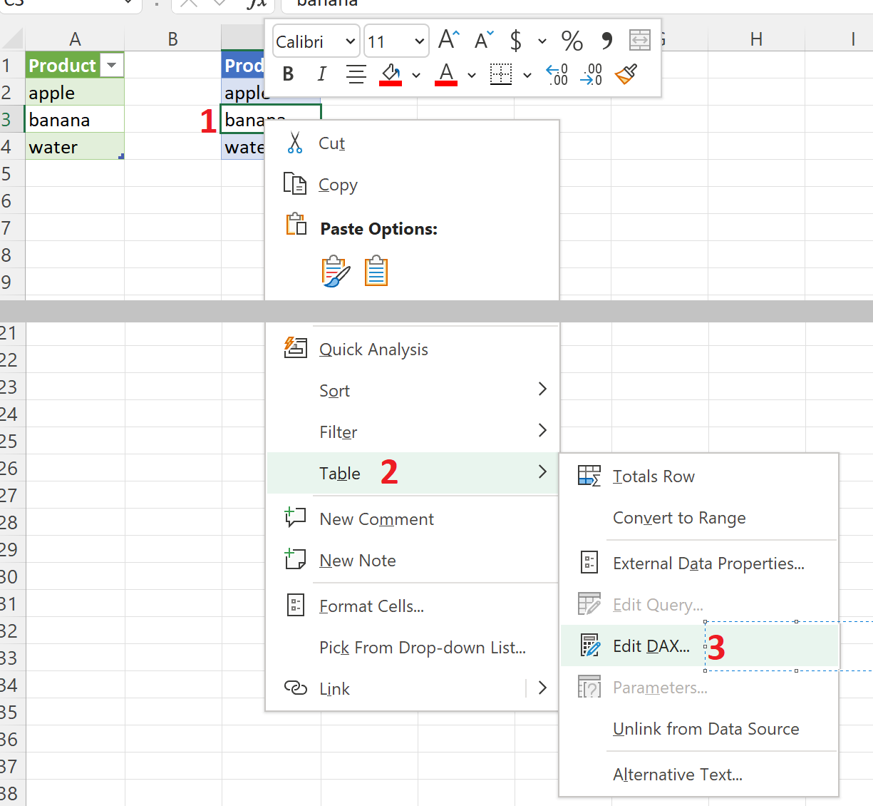 右键单击表并选择Edit DAX。然后,在计算命令之后,创建DAX代码。