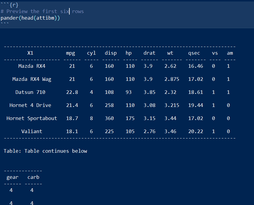当我试图查看数据帧结果时,R笔记本中的代码块输出没有出现(好像没有运行)。我必须通过pander()函数传递它,以查看输出打印结果。这跟针织品有关吗?我之所以提到这一点,是因为我在开始时将选项设置为: