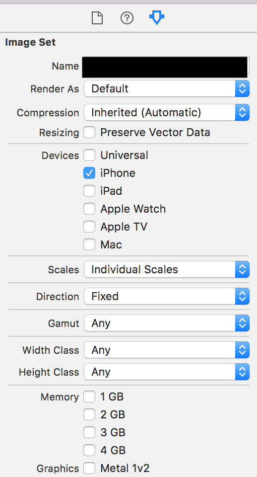 在向Assets.xcassets添加资产时,使用检查器窗口.更新资产属性。