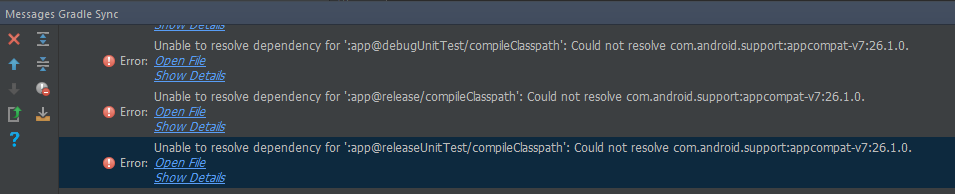 无法解决“:app@releaseUnitTest/compileClasspath”的依赖:无法解析com.android.support:appcompat-v7:26.1.0。无法解析com.android.support:appcompat-v7:26.1.0。需要: project :app无法解析com.android.support:appcompat-v7:26.1.0。>无法解析POM https://dl.google.com/dl/android/maven2/com/android/support/appcompat-v7/26.1.0/appcompat-v7-26.1.0.pom >已经看到doctype。