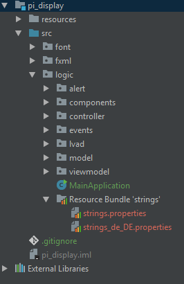 这两个文件strings.properties和strings_de_DE.properties存储在与MainApplication.java相同的目录中,所有三个文件都存储在pi_display/src/logic/目录中(IntelliJ将它们放入虚拟的"Resource“目录中,以便更清晰地显示项目结构)。
