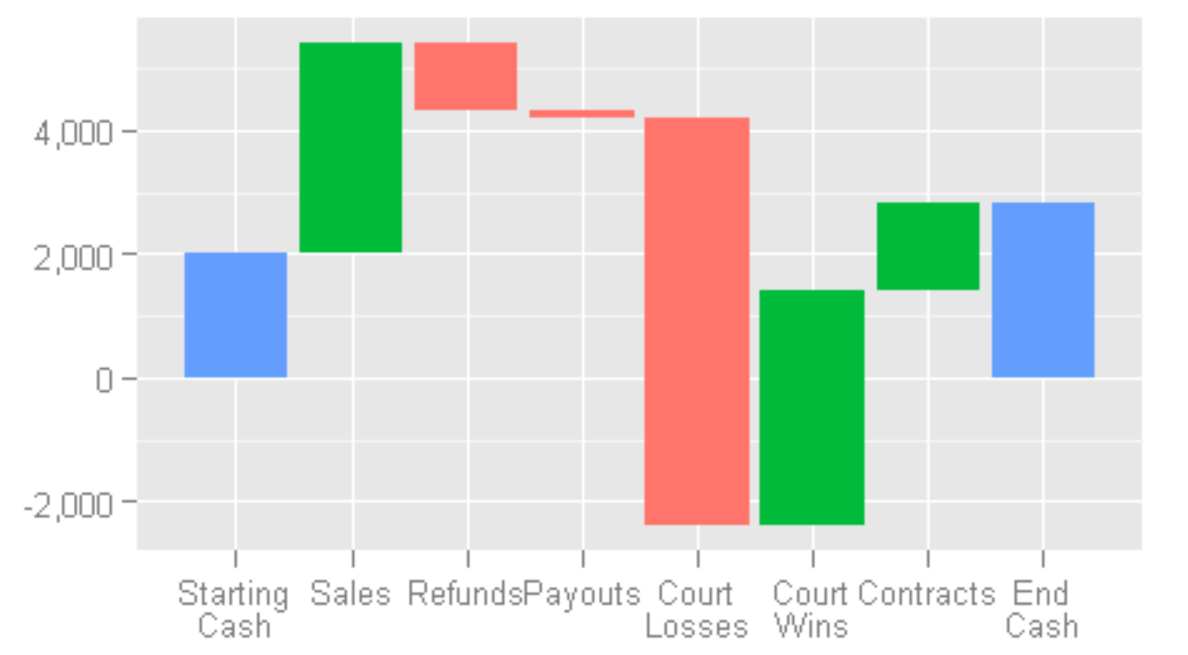 我找到了几个包,在R中创建了一个瀑布图,如下所示: