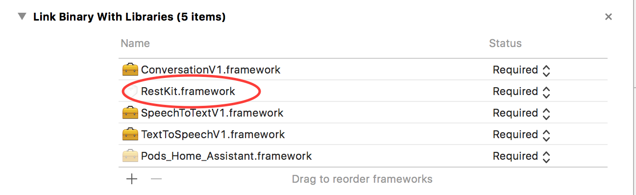 在构建阶段,打开“用库链接二进制”项并删除RestKit.framework。