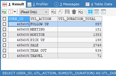 SELECT GROUP BY UTL_ACTION | SUM UTL_DURATION
