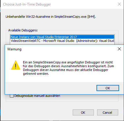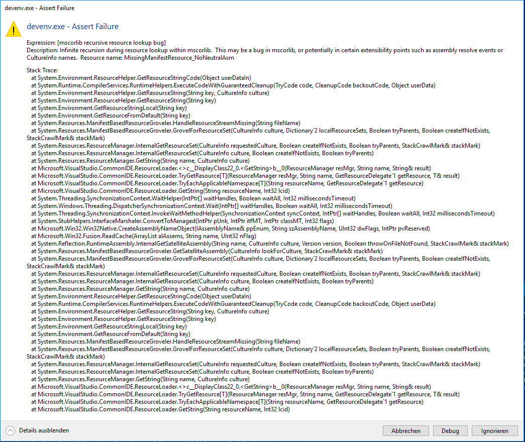 编辑:如果我在Visual中使用英语语言,我甚至不会收到异常。Visual只是停止,希望在Visual的新实例中启动新调试器,但无法执行。只有德文版本显示devenv.exe: Assert。