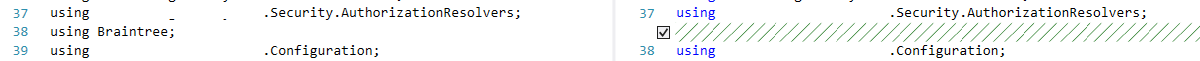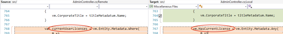这对我来说毫无意义。图4中第775行的本地代码在冲突解决工具中读取var currentUserLicenses,如图5所示,它显示了的本地代码(右边)是vm.HasCurrentLicense,而远程代码(左边)是var currentUserLicenses。
