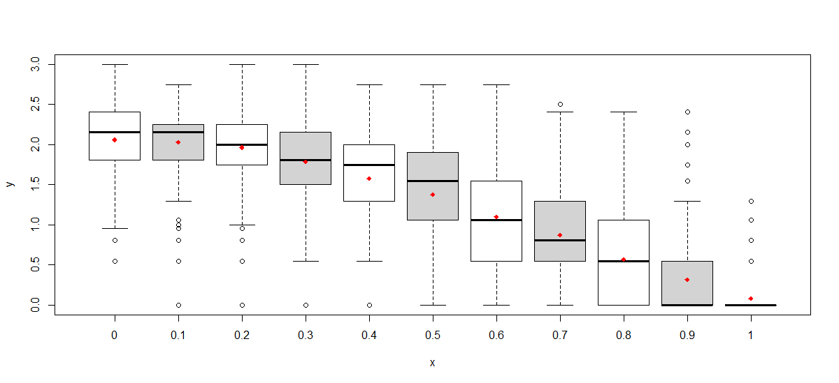 结果发现,我有两个变量不满足线性假设。因变量是连续的,自变量是数值离散的。在这里,剩余的情节和一个盒子和胡须图: