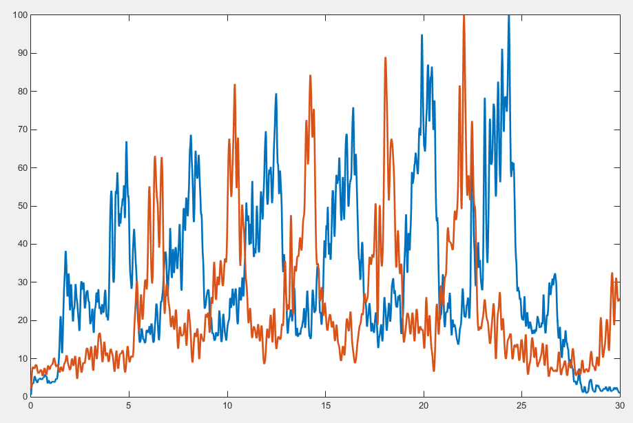 请注意,您没有相同数量的峰值,但这可能是您所能做的最好的。此外,假设两个数据数组具有相同的元素数、相同的原始时间向量等,这可能并不总是正确的。