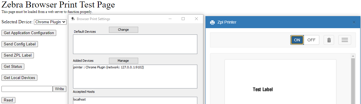 然后安装名为“Zpl打印机”的Chrome插件,并将其配置为在诸如9102这样的端口上侦听(浏览器打印为9100 & 9101)。