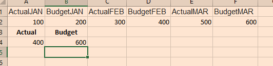 我建议以不同的方式构造您的数据。如果您将所有数据垂直排列并将数据分成三列,这将是一项更容易的任务。第一个是分类,它将填充“预算”或“实际”。下一篇专栏将是Month。在此之后,当然有值列。然后,使用基本的SUMIF,如"=SUMIF(A1:A6,预算“,C1:C6)。A1:A6是Excel将扫描所需变量的范围。在这种情况下,这个变量是“预算”。然后,C1:C6是对应于“预算”月份的值。只要您将SUMIF公式扩展到包含所有值,例如“SUMIF(A1:a 317,预算”,C1:C 317),该公式就会给出您想要的答案。
