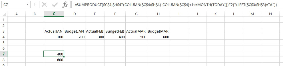 =SUMPRODUCT($C$4:$H$4*(COLUMN($C$4:$H$4)-COLUMN($C$4)+1<=MONTH(TODAY())*2)*(LEFT($C$3:$H$3)="B"))换C4:H4以适应你的号码范围。变更C3:H3适合您的专栏标题范围。将C4更改为数字范围的第一个单元格。