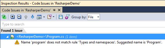 目前在VS 2012专业人员上使用ReSharper 2017.3.2。在这个非常简单的示例中更改名称空间和类名之后,ReSharper检查似乎忽略了以小写字母开头的名称空间。尽管如此,它似乎能识别以较低的clase字母开头的类名。我是不是做错什么了。我希望检查也能识别小写名称空间的定义。