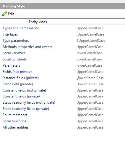 转到Resharper->Options->Code Editing>C#->命名样式: