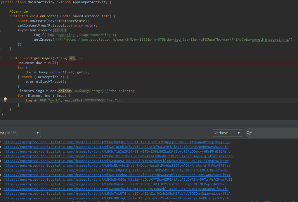 你得到了html,但是整个搜索页面。您可以使用css选择器和JSOUP库检索图片的urls (易于使用)。只需转到Chrome浏览器,然后选择Settings -更多的工具-开发工具。然后单击图片上的鼠标右键,然后选择inspect,您将看到哪个容器是图片的容器,什么div包含图像的src url,然后右击这个div并选择copy css selector。那就跟图书馆合作吧。