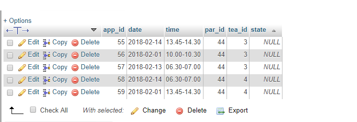 我创建了一个约会表,其中user1将添加约会,而user2将接受/拒绝该约会。现在,我的问题是,当单击接受和拒绝时,它分别显示在表中,但我只是不明白如何将insert查询添加到中,以便将其插入到数据库中。我尝试了几种方法,试图将stateaccept/reject插入到db中,但没有成功。我会请人帮我解决这个问题。谢谢。