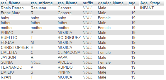SELECT res_fName,res_mName,res_lName,rs.suffix,rg.gender_Name,TIMESTAMPDIFF(YEAR,res_Bday,CURDATE()) AS age,