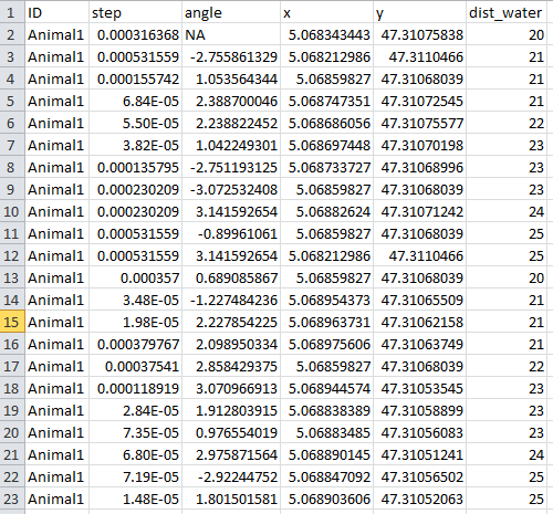 data <- prepData(output2,type="UTM",coordNames=c("Longitudes","Latitudes"));