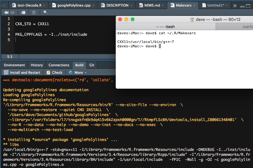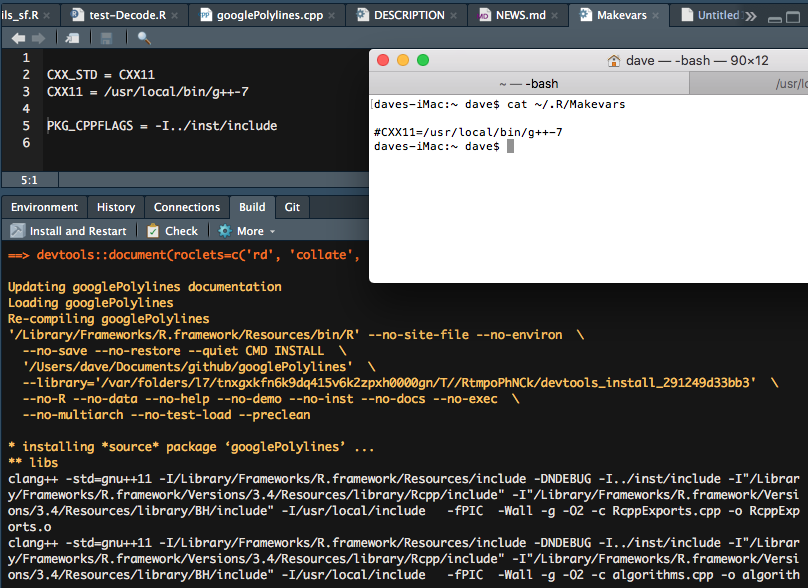 下面是屏幕截图,显示我正在使用的构建选项。在每种情况下,我都会同时显示Makevars