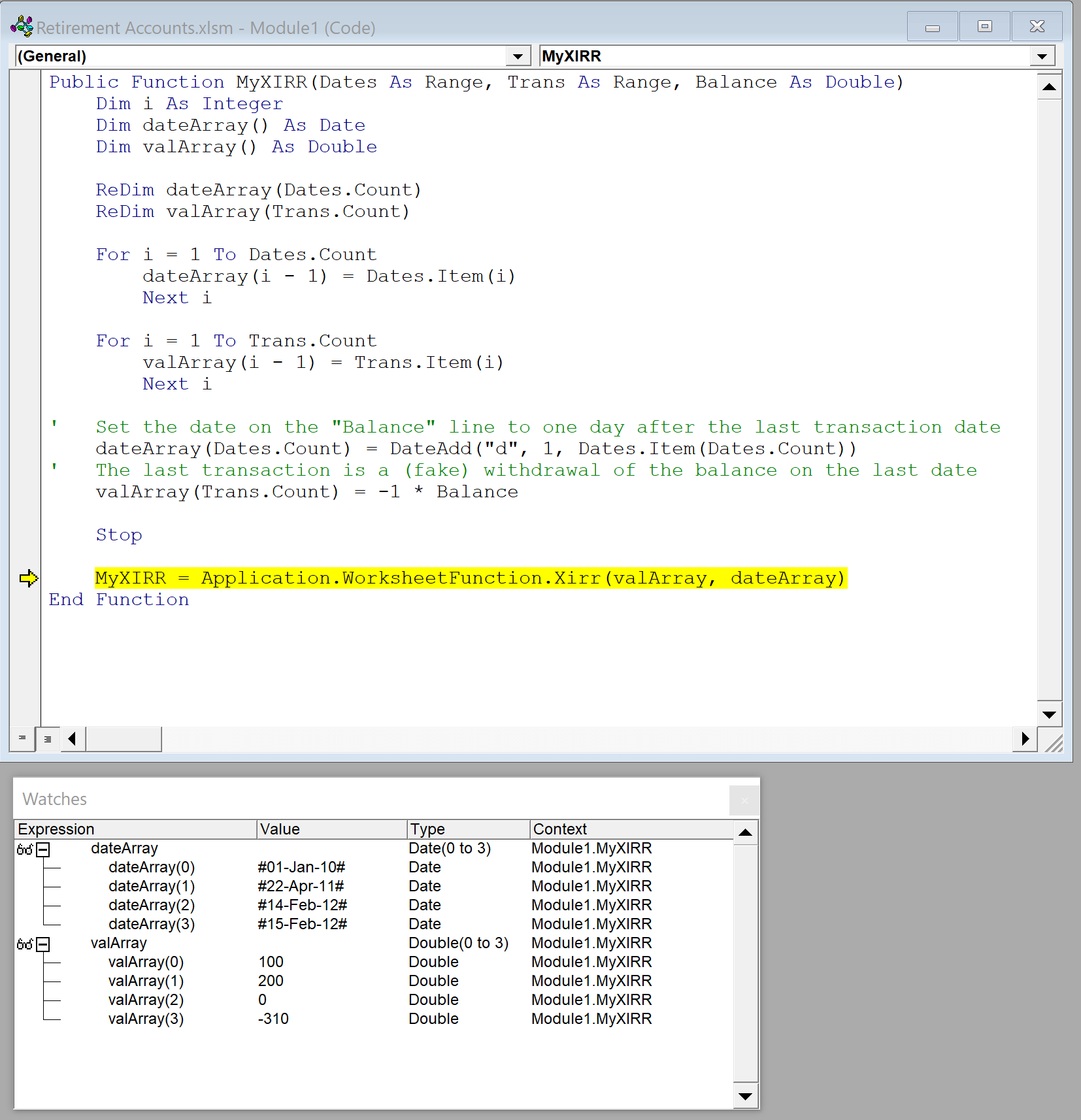 Public Function MyXIRR(Dates As Range, Trans As Range, Balance As Double)