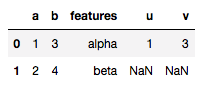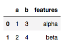 [[1, 3, 'alpha'], [2, 4, 'beta']], columns=['a', 'b', 'features'])