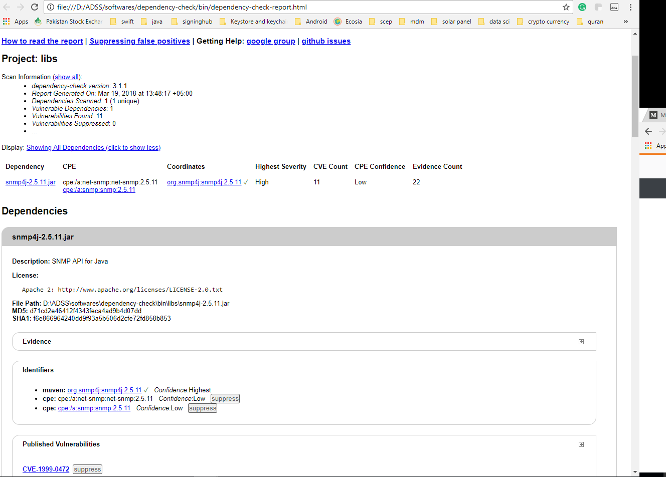 目前,我在我的java项目中使用SNMP4J发送陷阱(v1、v2和v3),但是当我试图使用使用NVD(国家漏洞数据库)的NIST依赖项检查工具检查安全性漏洞时,我发现存在一些安全漏洞。