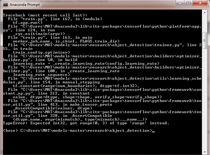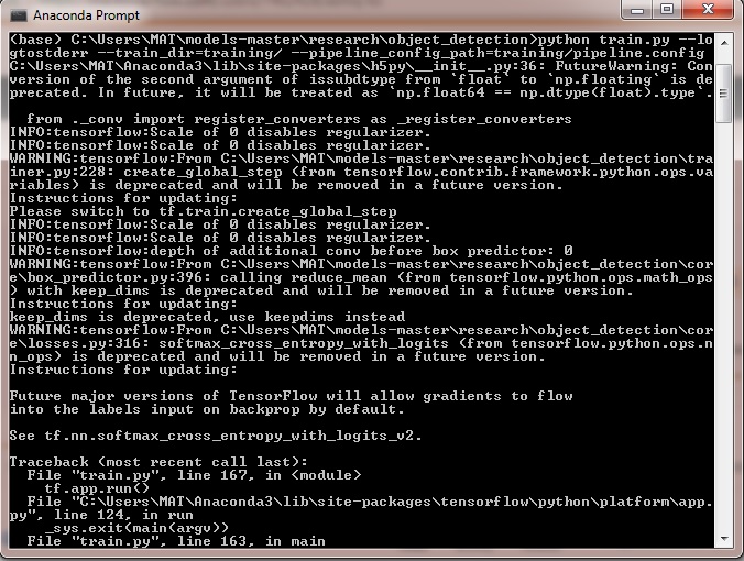 我使用300*300大小的图像来训练所有的模型。这里我附加了显示错误消息的命令提示符窗口的图像,我使用了tensorflow版本为1.5和python3.6。