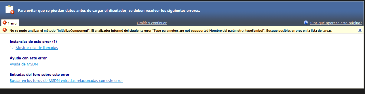 未能解析方法'InitializeComponent‘。解析器报告了以下错误“Type参数不支持的参数名称:Type parser”。请在“任务列表”中查找潜在错误。