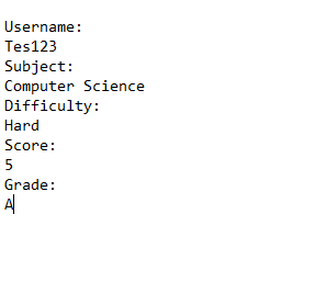 ‘n’,‘用户名:\n’,'Tes123\n','Subject:\n',‘计算机科学\n’,‘困难:\n’,‘难\n’,‘分数:\n’,‘5n’,‘等级:\n’,‘A’n‘