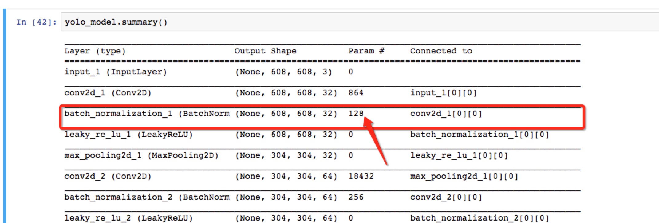 我正在阅读yolov2对象检测模型。所以我打印了yolo_model的摘要。但是当我逐行查看总结时,我发现批归一化层的参数计数是奇怪的,它是通道* 4,但据我所知,每个神经元单元都有4个批归一化层参数。因此,每个批处理归一化层的总计数应为4*单元计数。有人知道吗?