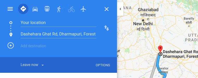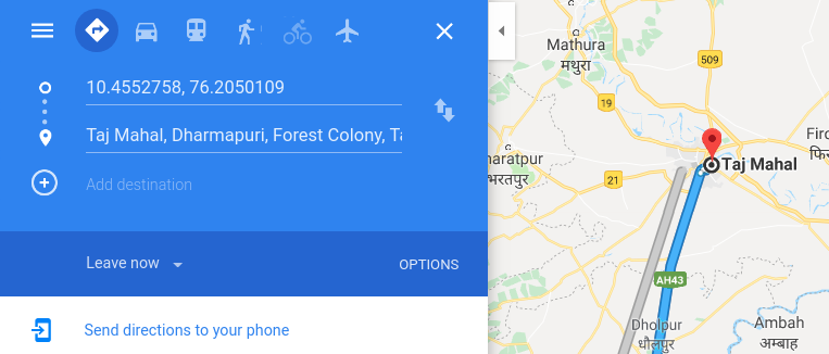 当提供lat/lngs时,destination参数看起来完全超过了destination_place_id参数,从而导致了坐标上的反向地理代码。在下面的示例URL中,我使用ChIJj61dQgK6j4AR4GeTYWZsKWw的Place ID,该ID对应于CA山景城的Googleplex作为destination_place_id,以及Taj的lat/lng作为destination;注意Googleplex查询被忽略,并执行反向地理代码获取印度的地址: