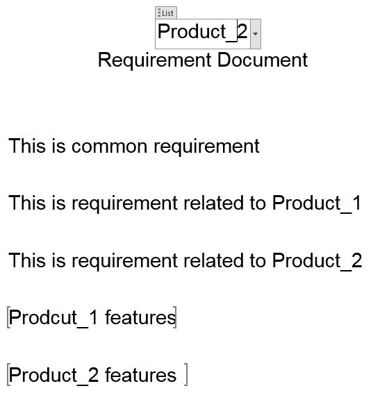 我想要创建一个包含产品名称的下拉列表的单一需求文档。每当有人选择一个产品时,文档就应该显示所有产品的共同需求、特定于该产品的需求以及隐藏特定于其他产品的需求。