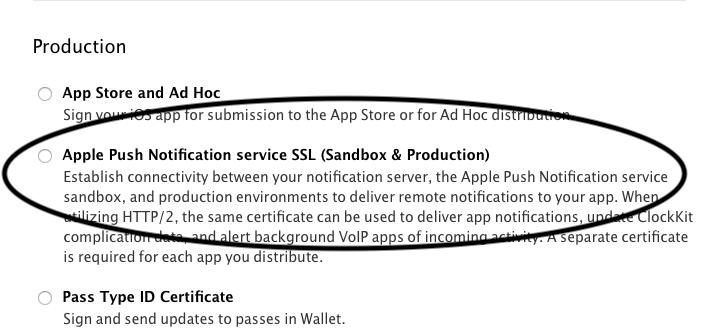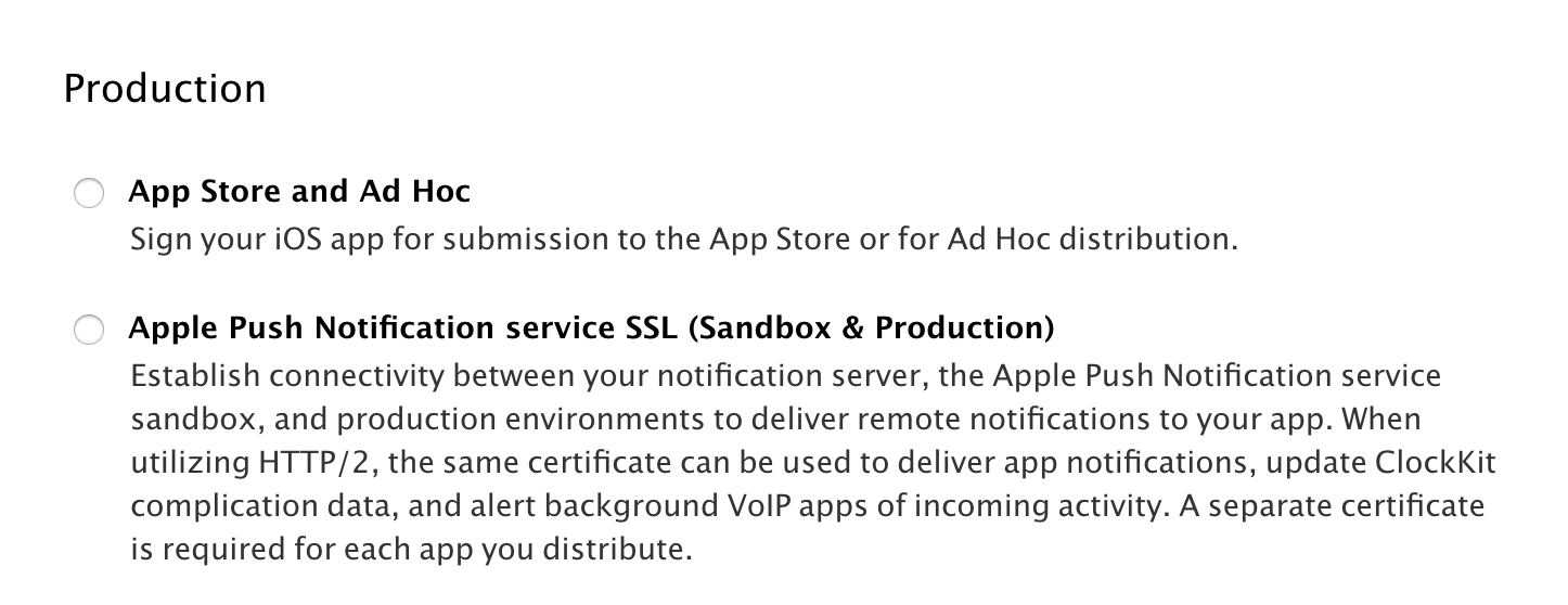 我将上传我的第一个iOS应用程序,我将在我的iOS应用程序中集成Firebase推送通知。iOS应用程序需要哪些证书? 应用商店和Ad产品证书只够应用程序分发吗?或者我需要应用商店和Ad,苹果推送通知服务SSL (Sandbox & Production),或者只需要苹果推送通知服务SSL (Sandbox & Production)?