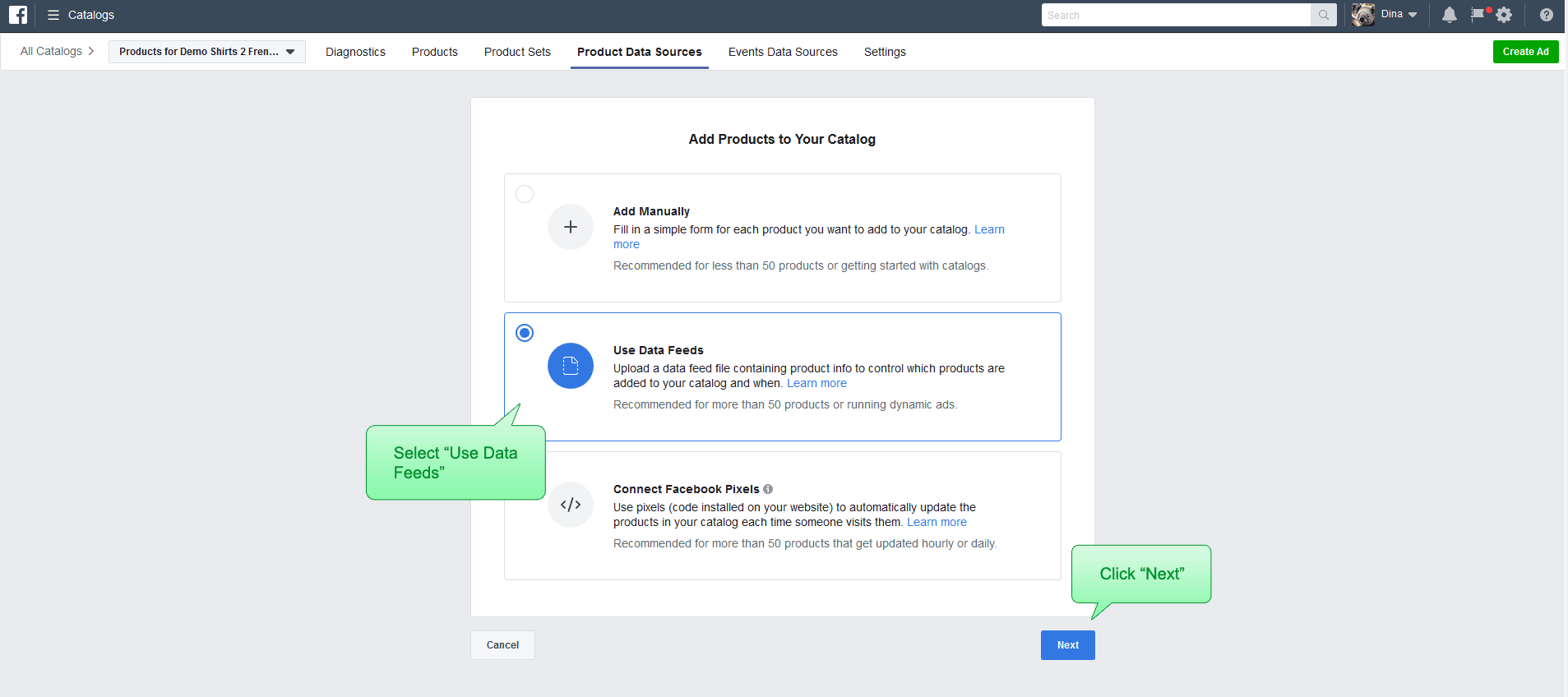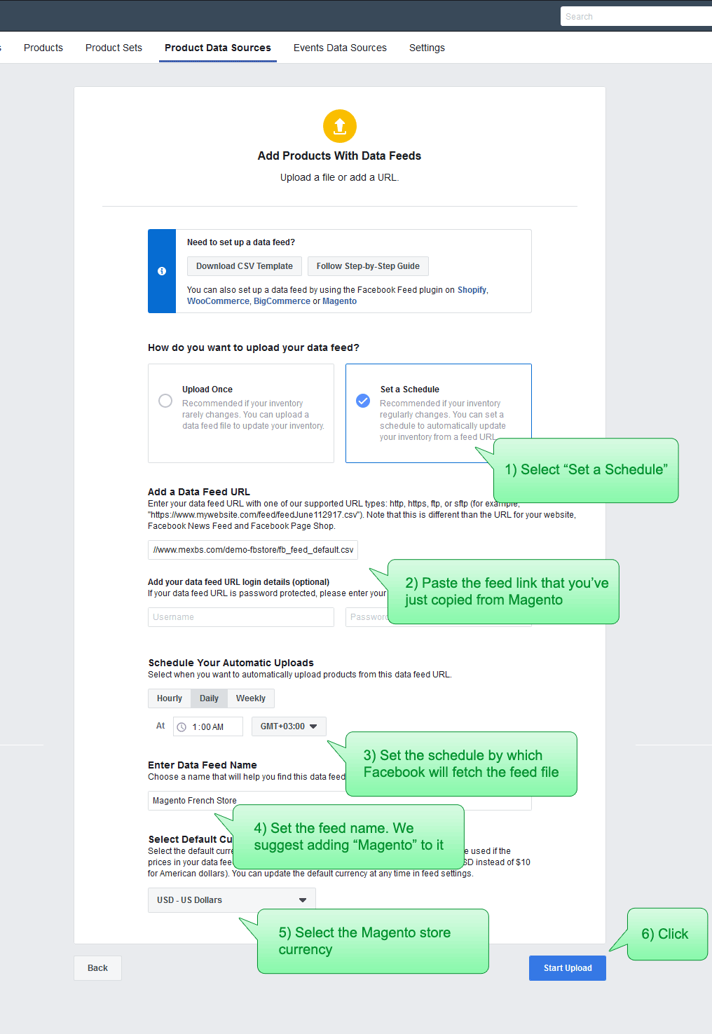 为了在Facebook业务经理目录(动态广告)或Facebook商店中显示Magento 2产品,您需要在您的Facebook Business Manager帐户中设置一个提要,并将其提供给您的feed的URL