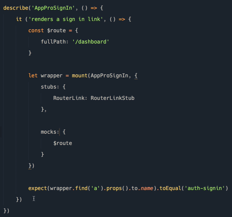 尽管我已经将VueRouter添加到localVue实例中,但它说它实际上找不到路由器链接组件。如果代码看起来有点古怪,那是因为我使用的是TypeScript,但是它应该读得非常接近ES6.主要是@Prop()与传入道具相同:{..}