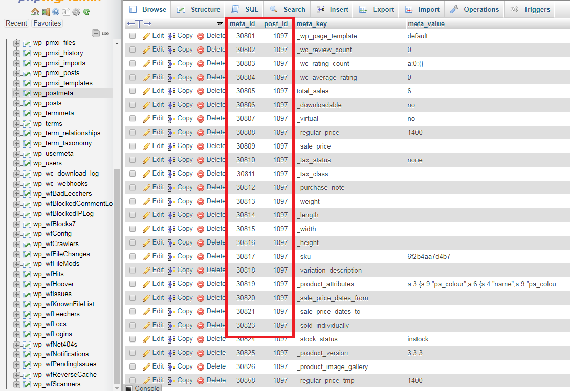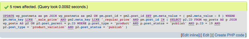 您将看到meta_id是不同的,而post_id是相同的,这是因为在WordPress中,post_id是产品,在本例中,它本身有许多变体,而meta_id是需要对每个变体进行更新的_sale_price部件。