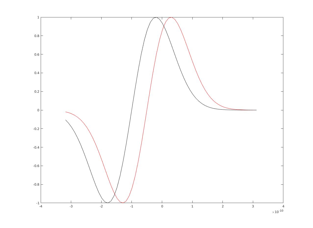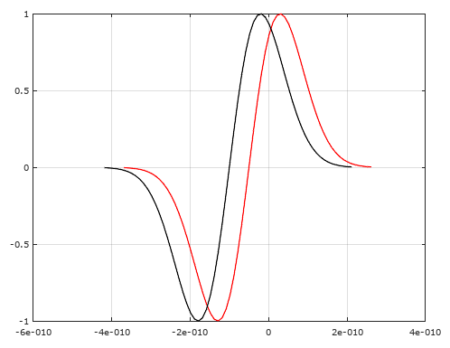 plot(t{1},y{1},'r',t{2},y{2},'k')它产生两个高斯单脉冲,稍微移动一些:
