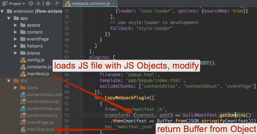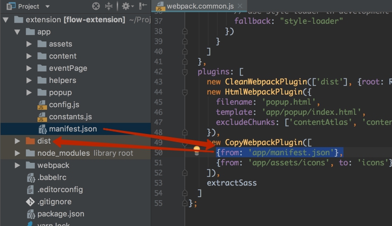 我正在利用Webpack为Chrome扩展创建我的资产。通常在manifest.json中,您应该有一些JS文件、一些HTML文件、和。