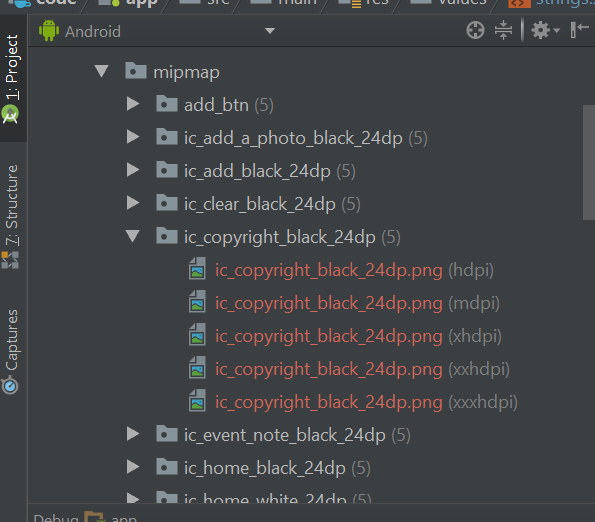 android.content.res.Resources$NotFoundException: File res/mipmap-xhdpi-v4/ic_copyright_black_24dp.png from xml type xml resource ID #0x7f0d0007上面的错误消息清楚地指出,在res/mipmap文件夹中找不到ic_copyright_black_24dp.png映像,检查该文件夹是否存在该文件。