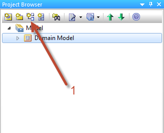 在提供了新项目在磁盘中的位置之后,将显示一个模型向导,从technology菜单中选择基本的UML 2技术,并在右侧检查域模型,然后在项目浏览器中单击下面的屏幕快照中提到的新图表图标: