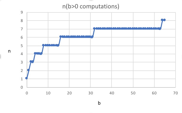 有趣的是,我们看到每个2的倍数(即1,2,4,8,16,32,64)的n个循环的增加。