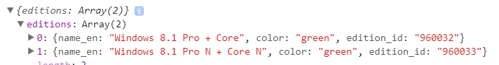 let response = {"editions":[{"name_en":"Windows 8.1 Pro + Core","color":"green","edition_id":"960032"},{"name_en":"Windows 8.1 Pro N + Core N","color":"green","edition_id":"960033"}]};