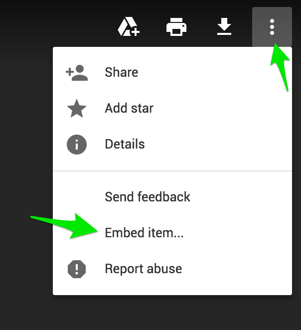 要获得您需要使用的URL,您需要选择页面顶部的三个点,然后选择"Embed“。您不想使用整个嵌入代码-只是URL。