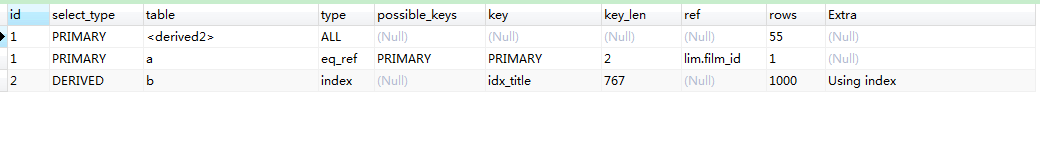 在第三行中,它显示它仍然扫描所有1000行。然后,我测试了子查询select film_id from sakila.film b order by title limit 50,5,解释日志如下所示
